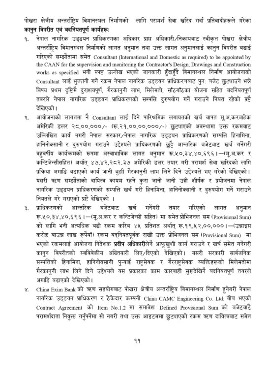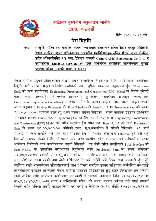 काठमाडौँ । अख्तियार दुरुपयोग अनुसन्धान आयोगले पोखरा अन्तर्राष्ट्रिय विमानस्थल निर्माणमा अनियमितता गरेको अभियोगमा तत्कालीन पर्यटन सचिव केदारबहादुर अधिकारीसहित २१ जना र दुई कम्पनीविरुद्ध भ्रष्टाचार मुद्दा दायर गरेको छ ।
