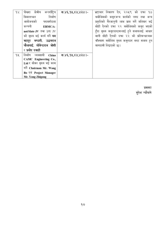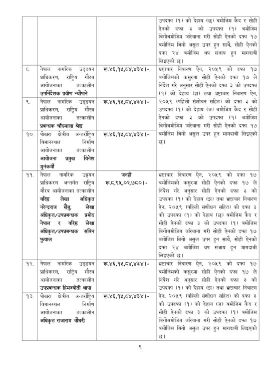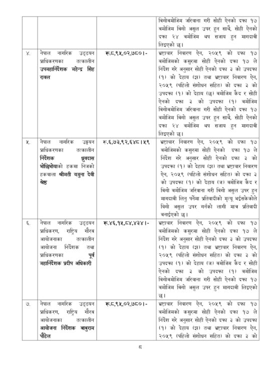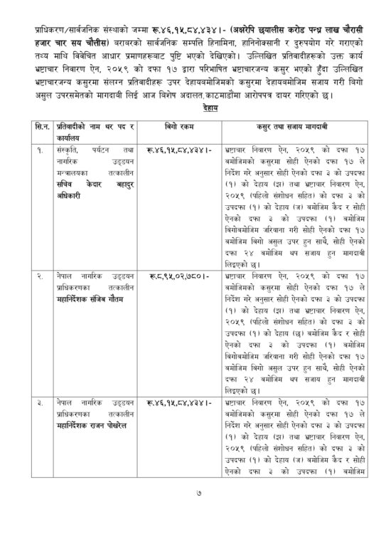 अख्तियारले आइतबार विशेष अदालतमा मुद्दा दायर गरेको हो । मुद्दा दायर भएकाहरुमा तत्कालीन सचिव अधिकारीसहित नेपाल नागरिक उड्डयन प्राधिकरणका तत्कालीन महानिर्देशक सञ्जीव गौतम, राजन पोख्रेल, बाबुराम पौडेल, चाँदमाला श्रेष्ठ, विनेश मुनकर्मी, राजाराम चौधरी, प्रदीप अधिकारीलगायत २१ जना छन् ।