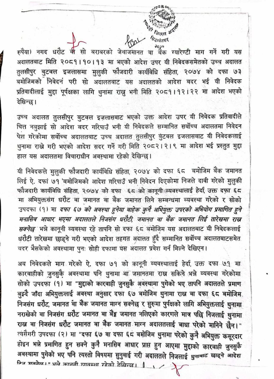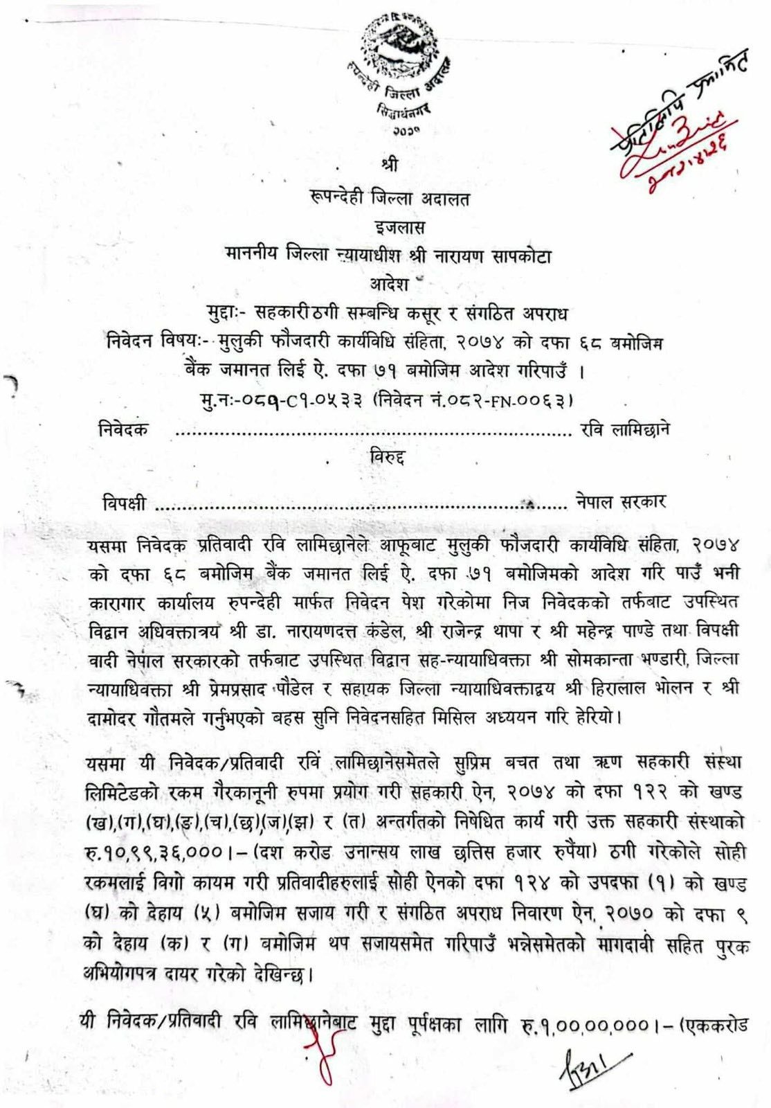 मुलुकी फौजदारी कार्यविधि संहिता २०७४ बमोजिम बैंक जमानत लिएर दफा ७१ बमोजिम आफूलाई रिहा गर्न माग गर्दै लामिछानेले निवेदन दिएका थिए ।