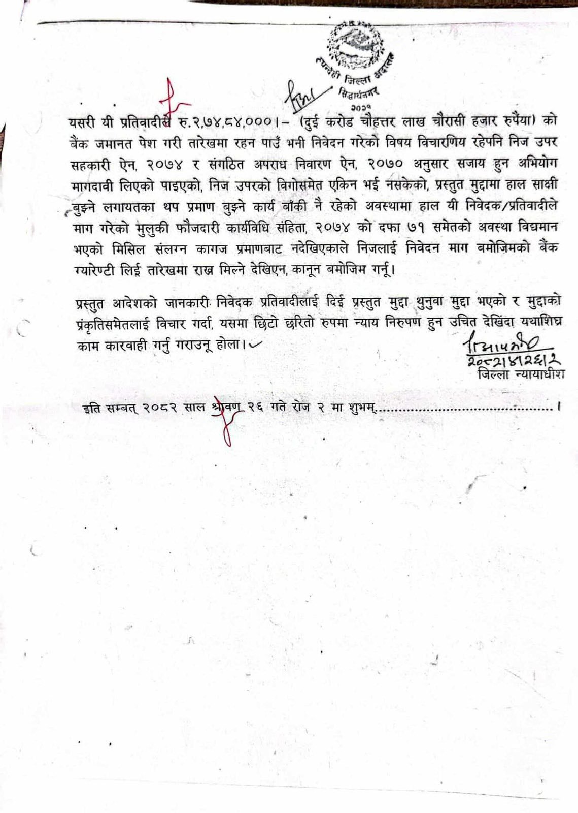 अदालतका सूचना अधिकारी पदम अर्यालले जिल्ला अदालतले बैंक ग्यारेन्टीका आधारमा लामिछानेलाई रिहा गर्न नसकिने आदेश दिएको जानकारी दिएका छन् । यसअघि अघिल्लो हप्ता लामिछानेका कानुन व्यवसायीले दुई पटक यो मुद्दाको पेसी स्थगित गर्नका लागि निवेदन दिएका थिए ।