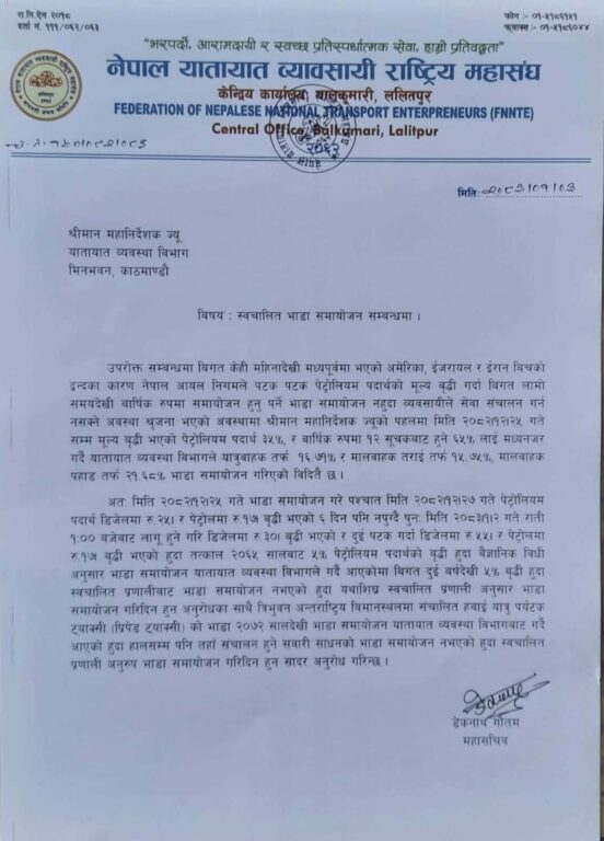 विज्ञप्तिमा भनिएको छ, ‘मिति २०८२/१२/२५ गते भाडा समायोजन गरे पश्चात मिति २०८२/१२/२७ गते पेट्रोलियम पदार्थ डिजेलमा २५ र पेट्रोलमा १७ रुपैयाँ वृद्धि भएको ६ दिन पनि नपुग्दै पुनः मिति २०८३/१/२ गते राति १ः०० बजेबाट लागू हुने गरि डिजेलमा रु.३०। वृद्धि भएको र दुई पटक गर्दा डिजेलमा ५५ रुपैयाँ । र पेट्रोलमा १७७ वृद्धि भएको हुँदा तत्काल २०६५ सालबाट ५% पेट्रोलियम पदार्थको वृद्धि हुँदा वैज्ञानिक विधि अनुसार भाडा समायोजन यातायात व्यवस्था विभागले गर्दै आएकोमा बिगत दुई वर्षदेखि ५% वृद्धि हुँदा स्वचालित प्रणालीवाट भाडा समायोजन नभएको हुदा यथाशिघ्र स्वचालि