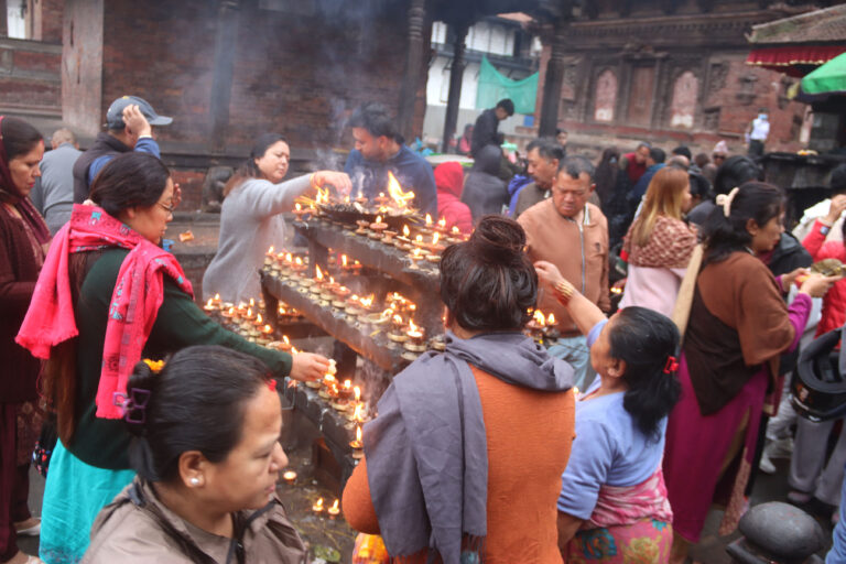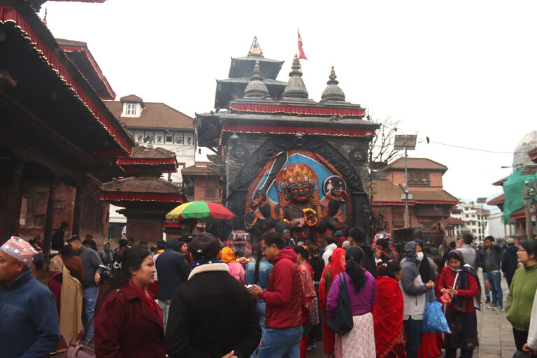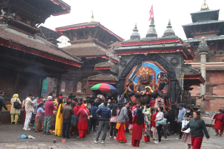 काठमाडौँकाे हनुमानढोका दरवार क्षेत्रमा रहेको कालभैरव मन्दिरमा शनिबार बिहान पूजाअर्चना तथा दर्शन गर्दै भक्तजन । तस्बिर : हरिराम भेटुवाल/रासस