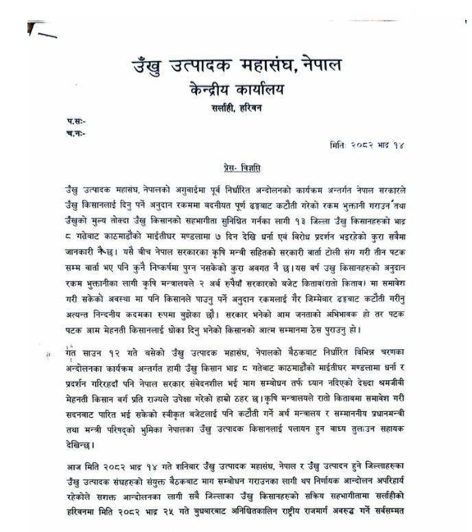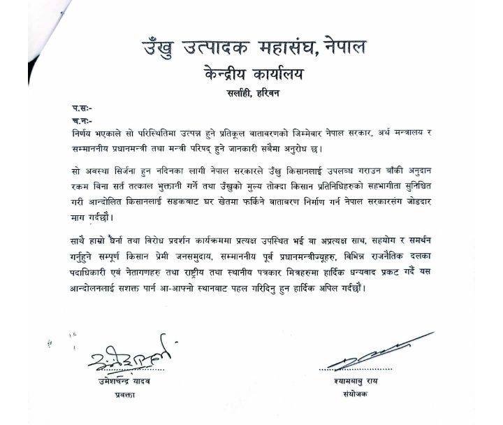 त्यसका लागि भदौ २५ गते सर्लाहीको हरिवनमा उपस्थित हुन उखु किसानलाई महासंघले आग्रह गरेको छ । महासंघले परिस्थिति प्रतिकूल बन्न नदिन सरकारले उखु किसानलाई उपलब्ध गराउन बाँकी अनुदान रकम विना सर्त तत्काल भुक्तानी गर्न र उखुको मूल्य तोक्दा किसान प्रतिनिधिहरूको सहभागिता सुनिश्चित गर्न पनि माग गरेको छ ।