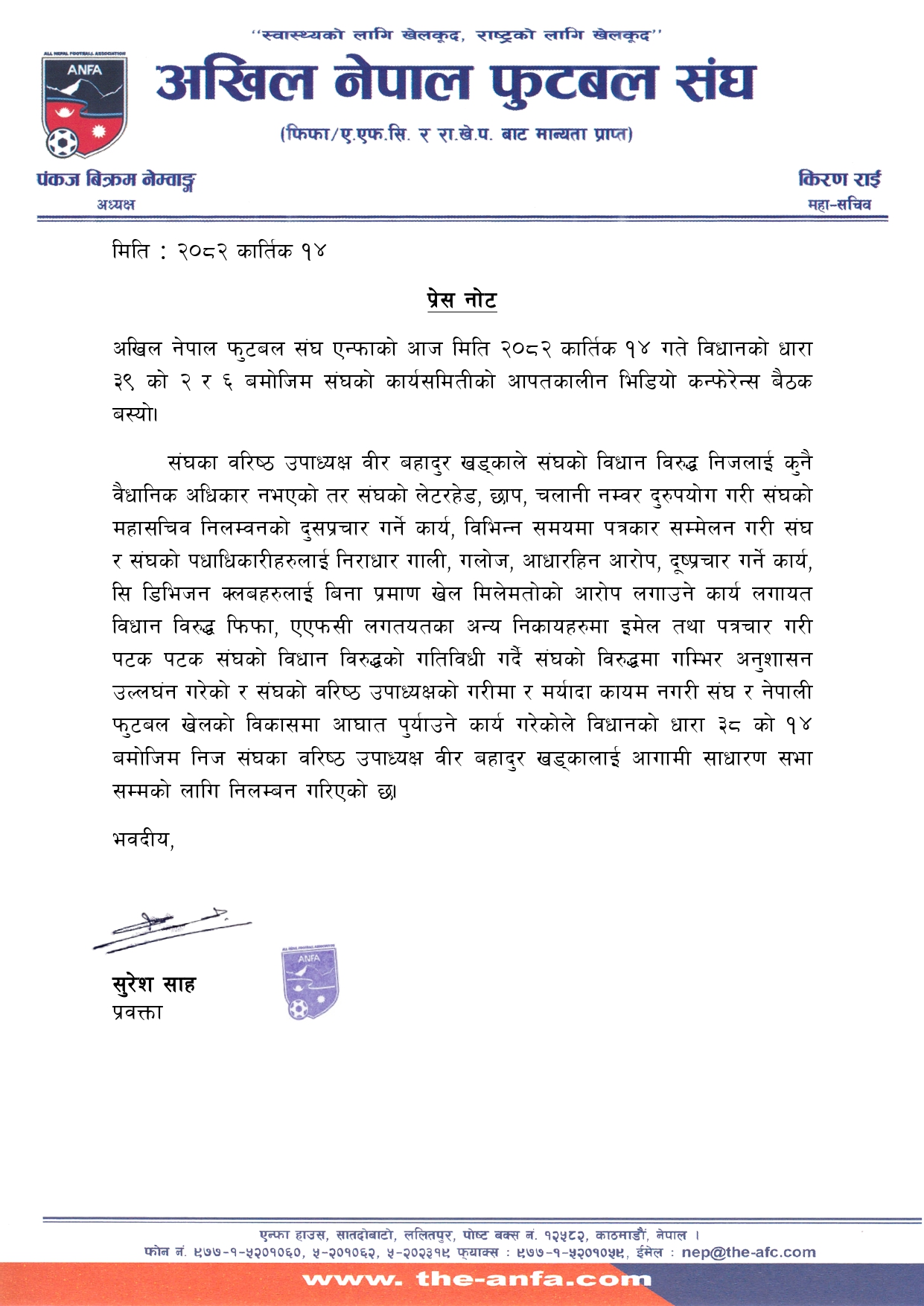 काठमाडौं । अखिल नेपाल फुटबल संघ(एन्फा) ले वरिष्ठ उपाध्यक्ष वीरबहादुर खड्कालाई निलम्बन गरेको छ । शुक्रबार बसेको एन्फाको आपतकालीन कार्यसमिति बैठकले खड्कालाई आगामी साधारण सभासम्मका लागि निलम्बन गर्ने निर्णय गरेको हो ।