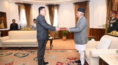 काठमाडौँ । राष्ट्रपति रामचन्द्र पौडेलसमक्ष नेपालका लागि विभिन्न पाँच मुलुकका राजदूतले मंगलबार राष्ट्रपति भवनमा आयोजित