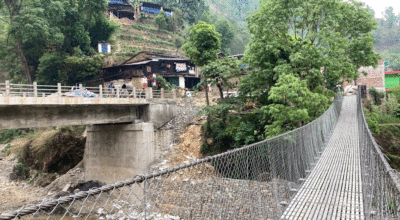 बागलुङ । काठे खोला गाउँपालिका–२ भिमपोखरा र वडा नं ४ तङ्ग्राम जोड्न डुडियाखोलामाथि स्टिलको झोलुंगे