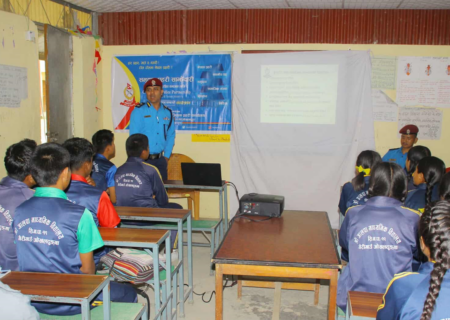 ‘साइबर’ कानुनबारे गाउँका विद्यार्थीलाई पढाउँदै प्रहरी
