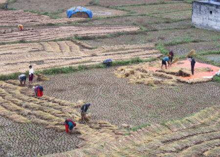 नुवाकोटका किसान बर्सातकै बीचमा धान भित्र्याउन व्यस्त