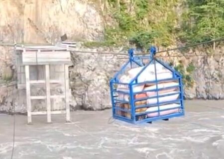 बाढीले फोक्सिङटारको मोटरेबल पुल बगाएपछि सामान ढुवानी गर्न घिर्नी