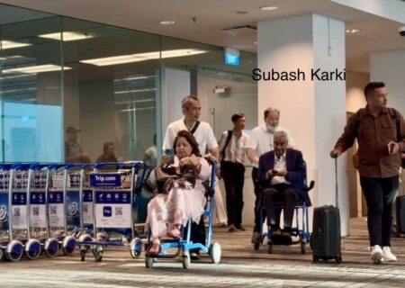 सिंगापुर विमानस्थलमा ह्विलचेयरमा देउवा दम्पती