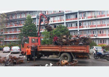 भारी उपकरणको सहयोगमा सिंहदरबार भित्रका जलेका सवारी हटाइँदै