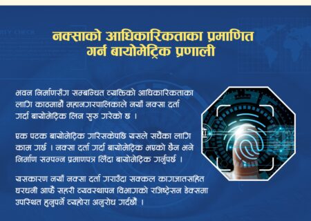 काठमाडौं महानगरमा भवन निर्माण इजाजतका लागि.नयाँ नक्सा दर्ता गर्दा घरधनीको बायोमेट्रिक लिन सुरु