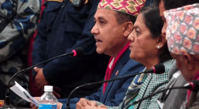 पूर्णबहादुर खड्काले पत्रकार सम्मेलन गर्दै