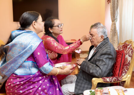 राष्ट्रपति पौडेलद्वारा शुभसाइतमा बहिनीहरूबाट तिहारको टीका ग्रहण