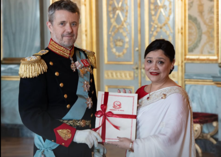 राजदूत तुलाधरद्वारा डेनमार्कका नरेश फ्रेडरिकसमक्ष ओहोदाको प्रमाणपत्र प्रस्तुत