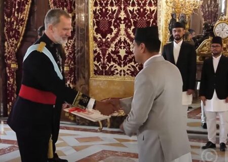 स्पेनका लागि नेपालका राजदूत शनिल नेपालद्वारा नरेश फेलिपे छैटौँसमक्ष ओहोदाको प्रमाणपत्र प्रस्तुत