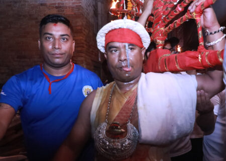 इन्द्रजात्राको अवसरमा मध्यपुरथिमिका वीरेन्द्रभक्तले चौथो पटक छेडाए जिब्रो