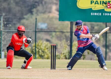 नेपाल नामिबियाविरुद्ध टस हारेर ब्याटिङ गर्दै
