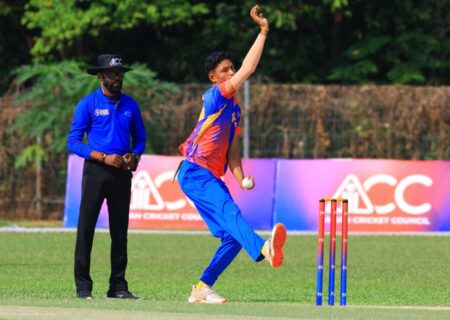 एसीसी यू–१६ क्रिकेटको दोस्रो खेलमा बलिङ गर्दै नेपाल
