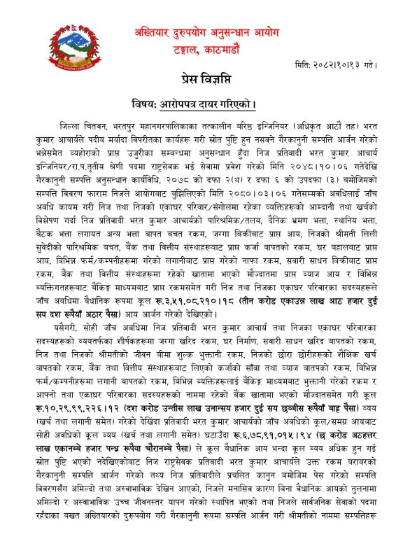 काठमाडौँ । अख्तियार दुरुपयोग अनुसन्धान आयोगले भरतपुर महानगरपालिकाका तत्कालीन वरिष्ठ इन्जिनियर भरत कुमार आचार्य र उनकी श्रीमतीविरुद्ध भ्रष्टाचार मुद्दा दायर गरेको छ । आयोगले मंगलबार ६ करोड ७८ लाख ९१ हजार १५ रूपैयाँ ९४ पैसा गैरकानुनी सम्पत्ति आर्जनको अभियोगमा विशेष अदालतमा मुद्दा दायर गरेको हो ।