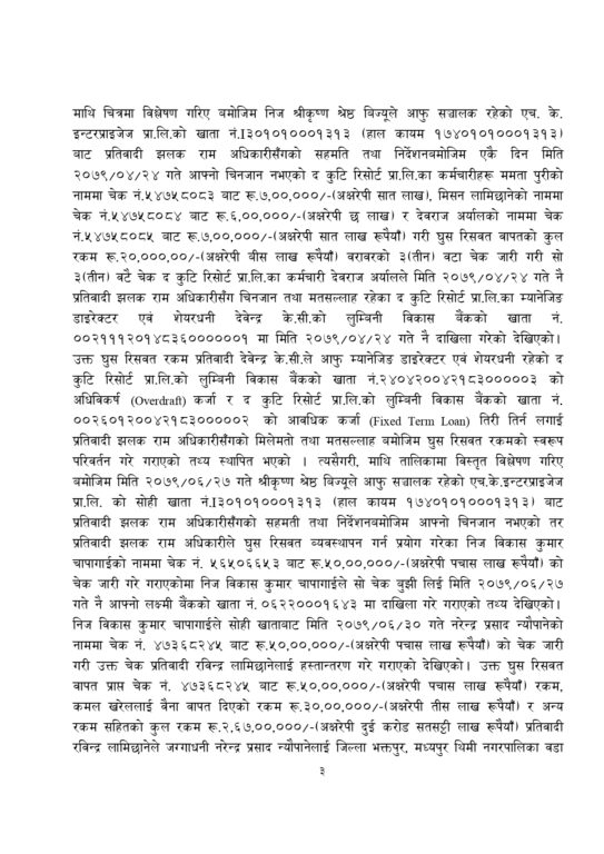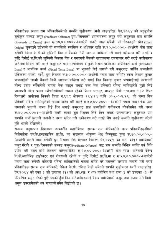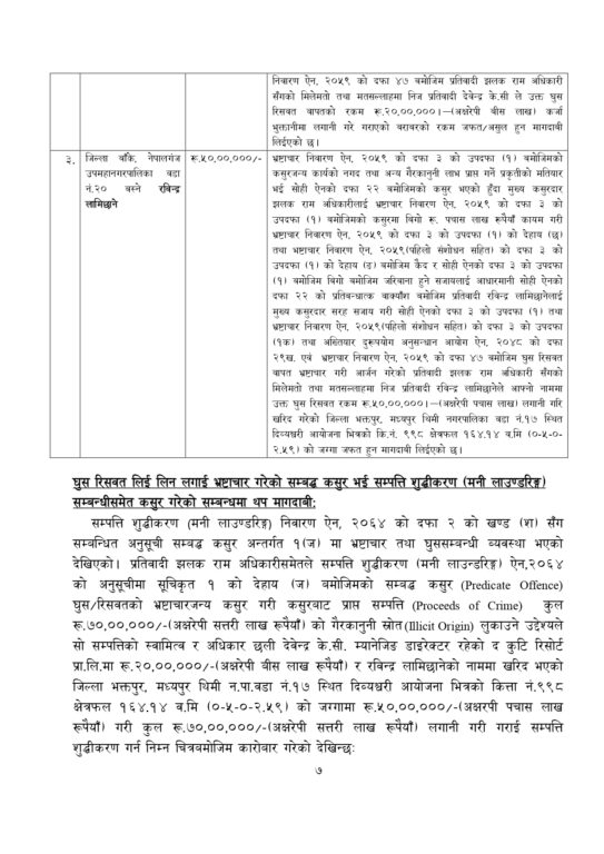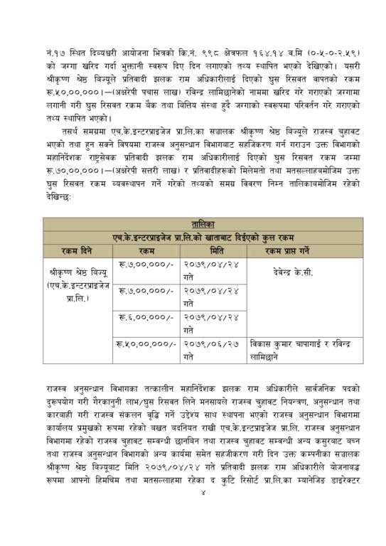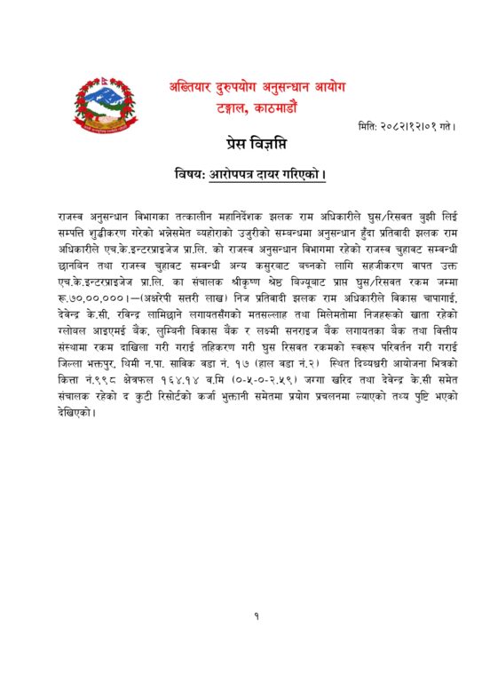 अधिकारीले एचके इन्टरप्राइजेज प्रालिको राजस्व अनुसन्धान विभागमा रहेको राजस्व चुहावट सम्वन्धी छानबिन तथा राजस्व चुहावट सम्वन्धी अन्य कसुरबाट बच्न सहजीकरण गरे वापत उक्त रकम लिएको अख्तियारको आरोप छ ।