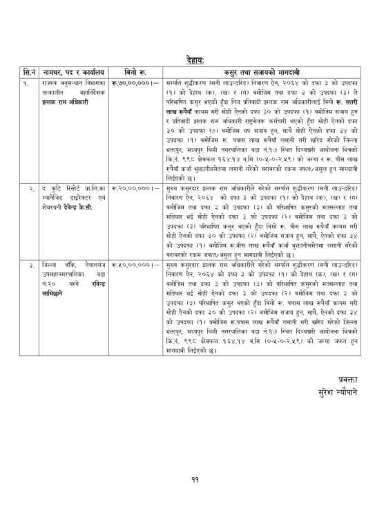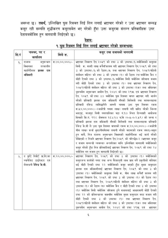 काठमाडौँ । अख्तियार दुरुपयोग अनुसन्धान आयोगले राजस्व अनुसन्धान विभागका तत्कालीन महानिर्देशक झलकराम अधिकारीसहित तीन जनाविरुद्ध भ्रष्टाचार मुद्दा दायर गरेको छ । आयतबार अख्तियारले अधिकारीले ७० लाख रुपैयाँ घुस लिएको आरोपमा विशेष अदालतमा मुद्दा दायर गरेको हो ।