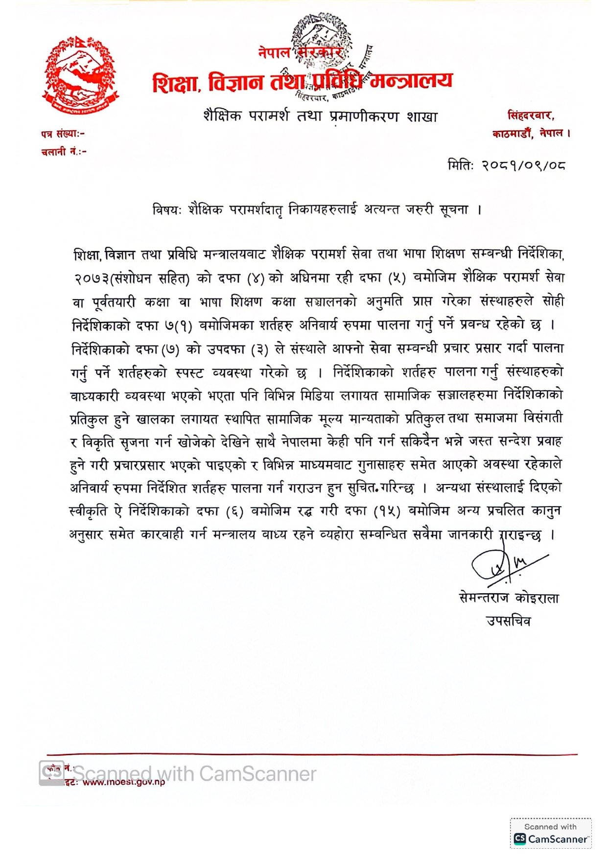 मन्त्रालयले शैक्षिक परामर्श दाता निकायहरूका नाममा सूचना जारी गरी जथाभावी सामग्री प्रकाशन नगर्न आग्रह गरेको हो ।