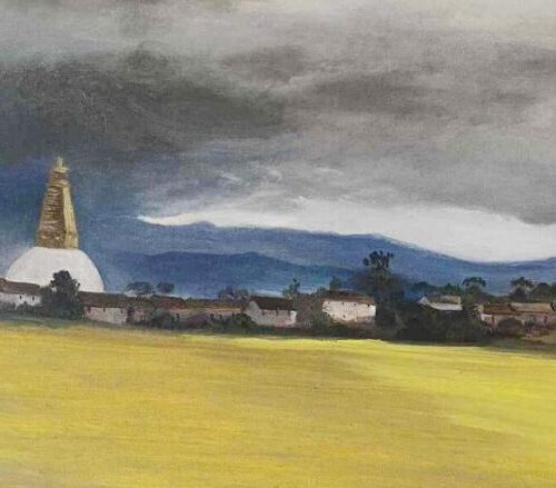 चितवनको भरतपुरस्थित घर नजिकै आमाले हरेक हप्ता त्यही गुम्बामा लैजान्थेँ । उनको मानसपटकमा त्यो गुम्बा रहिरह्यो । जहिले पनि त्यहाँ पुग्दा उनलाई शान्ति मिल्थ्यो । त्यो बाल्यकालको छाप काठमाडौँ आउँदा पनि मेटिएन । गुम्बाको याद सधैँ आइरहने हुँदा तेल रङले क्यान्भासमा उतारेर राखे । एक वर्षअघि बनाएको चित्र अहिले उनको सानेपामा जारी पहिलो एकल कला प्रदर्शनीमा समावेश छ ।