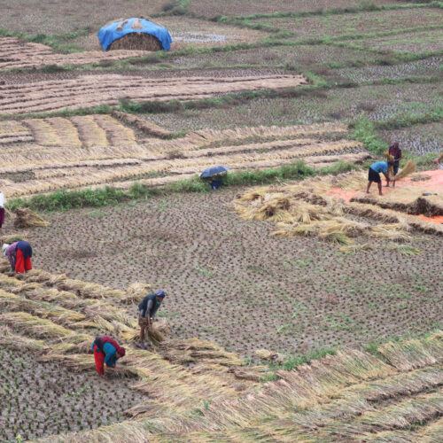 नुवाकोट । नुवाकोटका किसान धानबाली भित्र्याउन व्यस्त देखिएका छन्। लगातारको सिमसिमे वर्षाका बीच पनि आज किसान धान काट्ने, चुट्ने र भित्र्याउने काममा जुटिरहेका छन्।