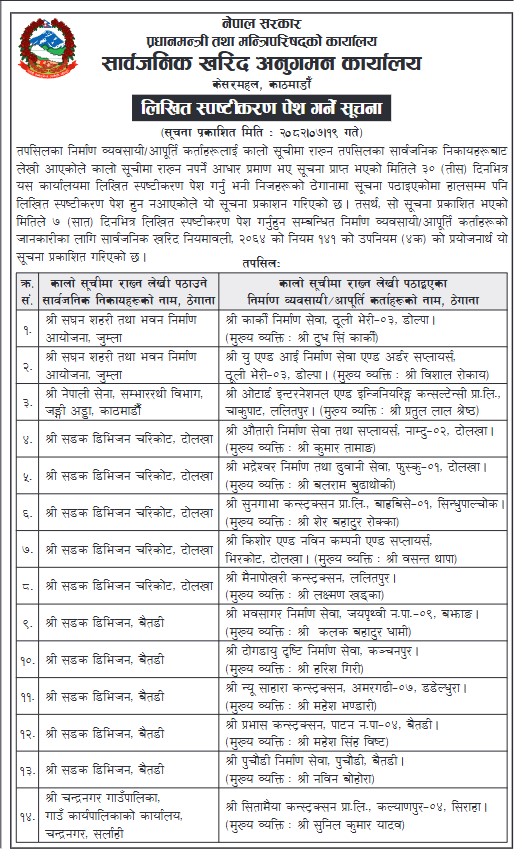 कार्यालयले बुधबार सूचना जारी गरी विभिन्न निकायबाट कालोसूचीमा राख्नको लागि लेखी पठाएअनुसार ती निर्माण कम्पनीसँग लिखित स्पष्टीकरण माग गरेको हो । अबको सात दिनभित्र चित्तबुझ्दो स्पष्टीकरण नआए कालोसूचीमा राखिने सूचनामा उल्लेख छ ।