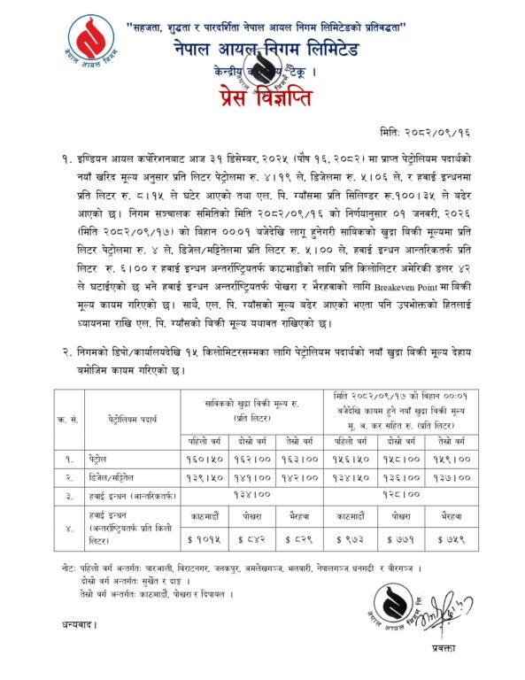 काठमाडौँ । पेट्रोलियम पदार्थको मूल्य घटेको छ । नेपाल आयल निगमले बुधबारदेखि लागू हुने गरी पेट्रोलियम पदार्थको मूल्य घटाएको हो । निगमकाअनुसार पेट्रोलमा प्रतिलिटर ४ र डिजेल मट्टीतेलमा पाँच रुपैयाँ मूल्य घटेको छ ।