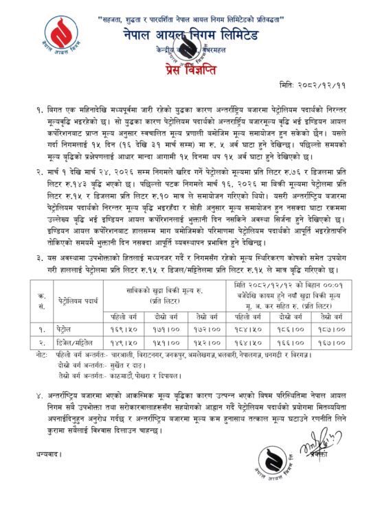 निगमले बुधबार मध्यरातिदेखि लागू हुने गरी पेट्रोल, डिजेल र मट्टितेलको मूल्यमा प्रतिलिटर १५ रुपैयाँले वृद्धि गरेको हो । यसअघि निगमले डिजेलमा १० र पेट्रोलमा १५ रुपैयाँ मूल्यवृद्धि गरेको थियो ।