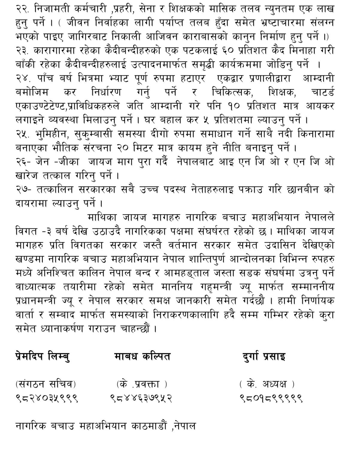 त्यस्तै संविधान खारेज गरी बौद्ध किराँत सहित वैदिक सनातन धर्म सापेक्ष हिन्दू अधिराज्य र संवैधानिक राजसंस्थाको स्थापना गरिनुपर्ने माग गरिएको छ ।