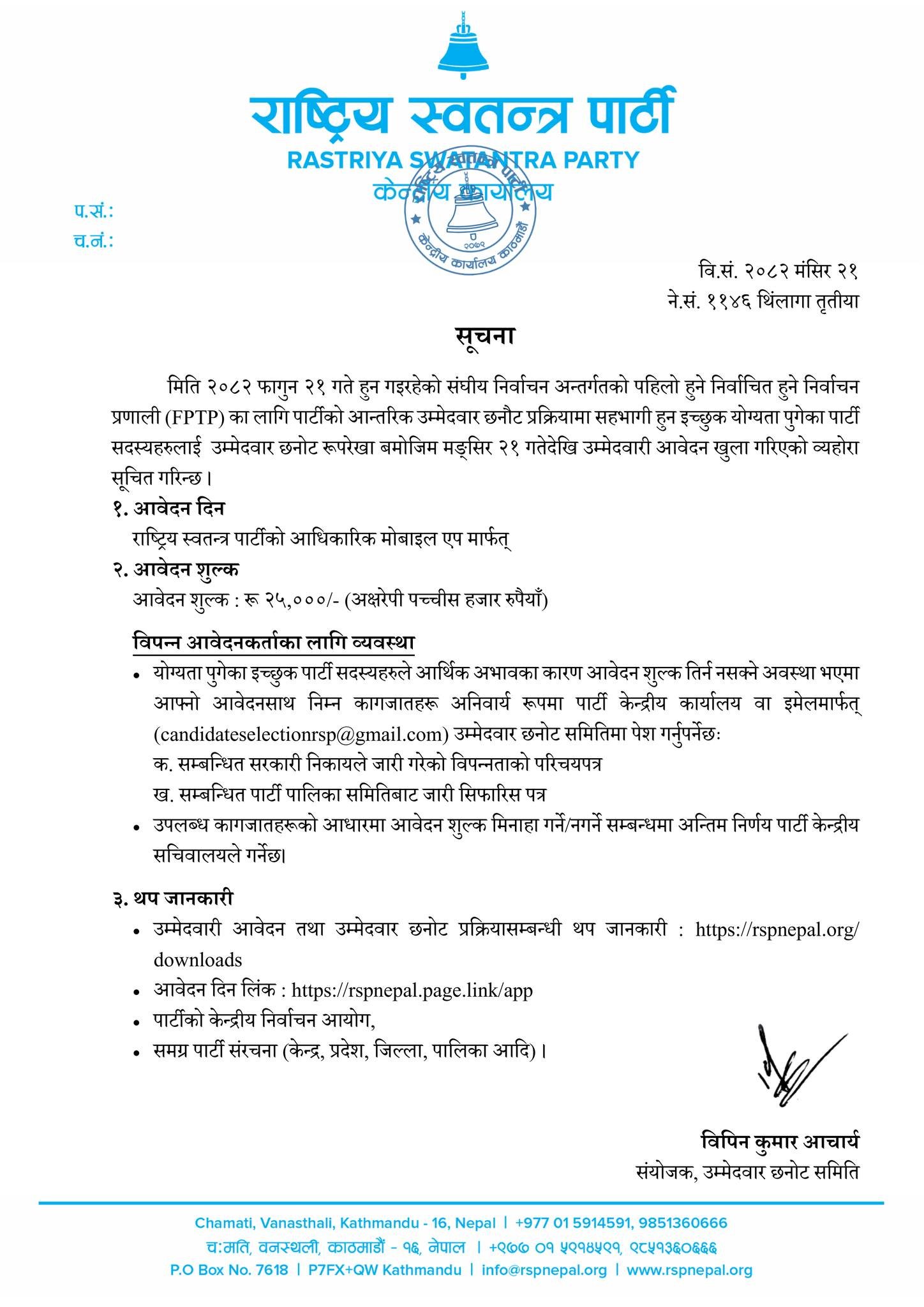 रास्वपाले पार्टीको आन्तरिक उम्मेदवार छनोट प्रक्रियामा सहभागी हुन इच्छुक योग्यता पुगेका पार्टी सदस्यहरूलाई उम्मेदवार छनोट रूपरेखाबमोजिम आजदेखि उम्मेदवारी आवेदन खुला गरेको हो । पार्टीको मोबाइल एपमार्फत पनि आवेदन दिन सकिने रास्वपाले जनाएको छ ।
