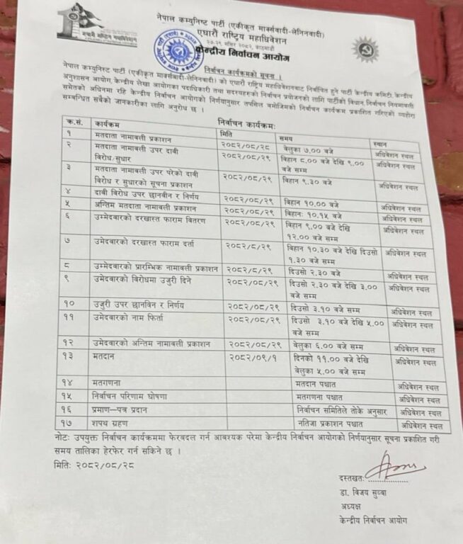 काठमाडौँ । नेपाल कम्युनिष्ट पार्टी (एमाले) को ११औँ राष्ट्रिय महाधिवेशनले नयाँ निर्वाचनका लागि निर्वाचन कार्यतालिका सार्वजनिक गरेको छ ।