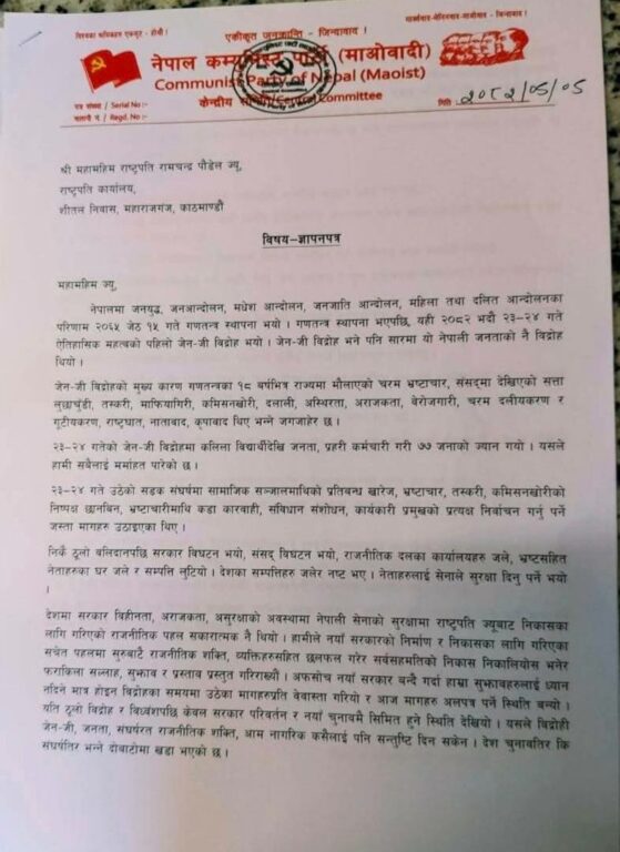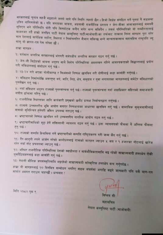 ज्ञापनपत्रमा भनिएको छ, ‘यदि जनताका भावना, अग्रगामी राजनीतिक प्रस्ताव र जेनजीका आवाजहरूलाई समयमै सुनिएन भने परिस्थिति फेरि पनि विस्फोटक बन्दैन भनेर भन्न सकिँदैन । तसर्थ परिस्थितिको यो गम्भीरतालाई मध्यनजर गर्दै हाम्रो जनप्रिय पार्टी नेपाल कम्युनिस्ट पार्टी(माओवादी) का तर्फबाट तत्काल निम्न मागहरू पूरा गरेर मात्र देशलाई सापेक्षिक शान्ति, स्थिरता र निर्वाचनतिर लैजान सकिन्छ भन्ने मान्यताकासाथ महामहिम राष्ट्रपति ज्यू सामु यो ज्ञापन पत्र पेस गरेका छौँ ।’