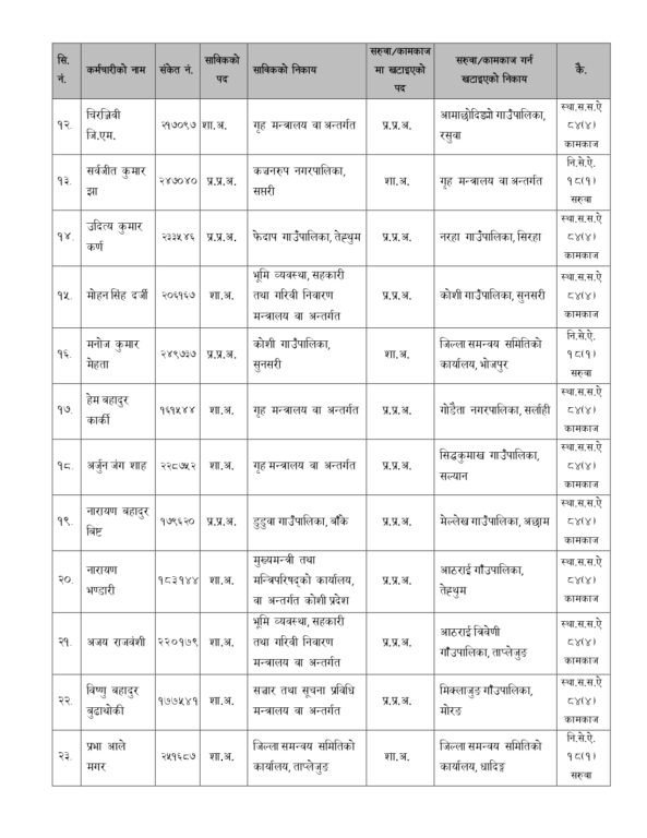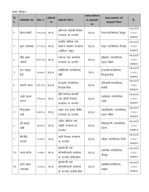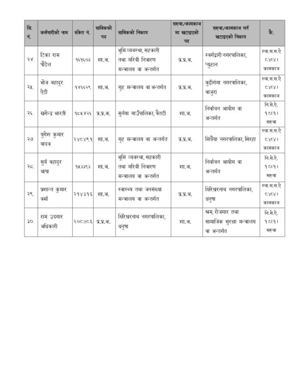 काठमाडौँ । सङ्घीय मामिला तथा सामान्य प्रशासन मन्त्रालयले १० जना उपसचिव र ३० जना शाखा अधिकृतको सरुवा गरेको छ । सरूवा भएका अधिकांशलाई पालिकामा प्रशासकीय अधिकृतको जिम्मेवारी दिइएको छ ।