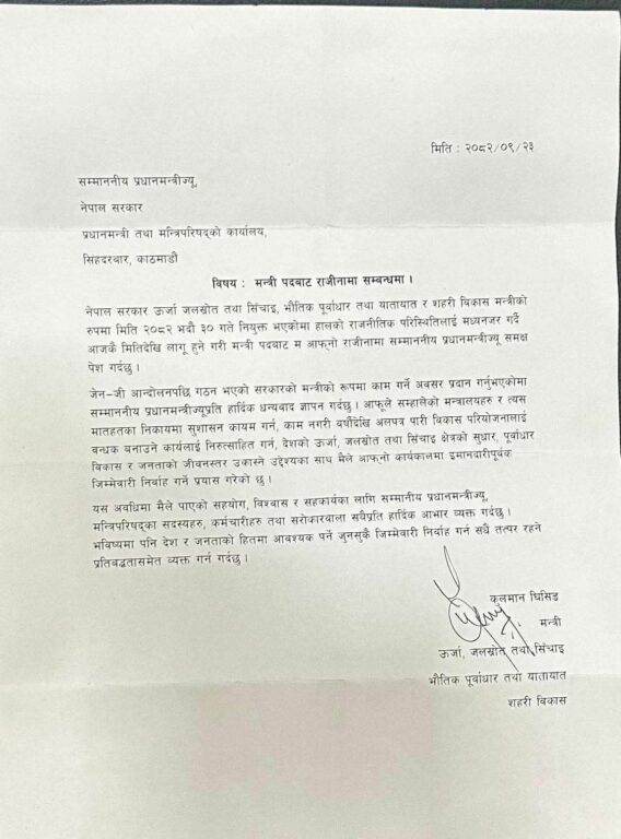 काठमाडौँ । ऊर्जा, भौतिक पूर्वाधार र सहरी विकास मन्त्री कुलमान घिसिङले राजीनामा दिएका छन् । तीन मन्त्रालय सम्हालेका मन्त्री घिसिङले बुधबार साँझ बालुवाटार पुगेर प्रधानमन्त्री सुशीला कार्कीसमक्ष राजीनामा बुझाएका हुन् ।