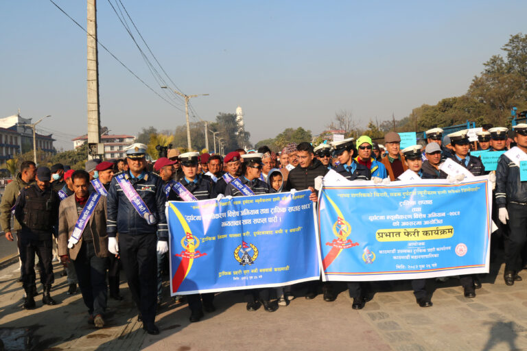 काठमाडौं । ‘दुर्घटना न्यूनीकरण विशेष अभियान तथा ट्राफिक सप्ताह’ सुरु भएको छ । काठमाडौं उपत्यका ट्राफिक प्रहरी कार्यालयको आयोजनामा सडक दुर्घटना कम गर्ने र आम नागरिकमा ट्राफिक सचेतना फैलाउने उद्देश्यले शनिबारदेखि अभियान सुरु गरिएको हो ।