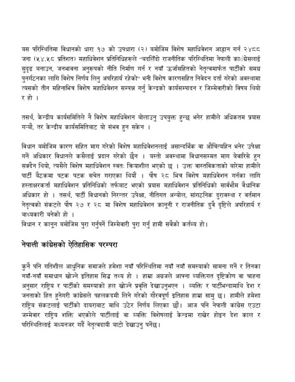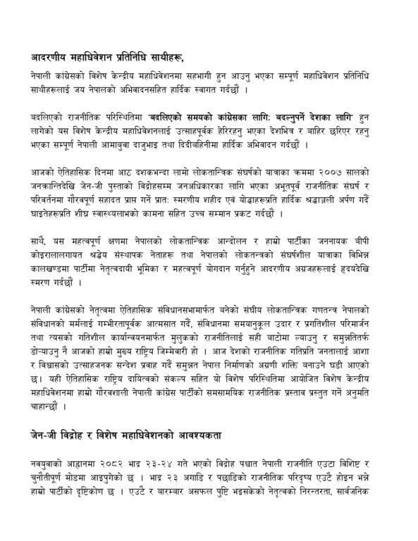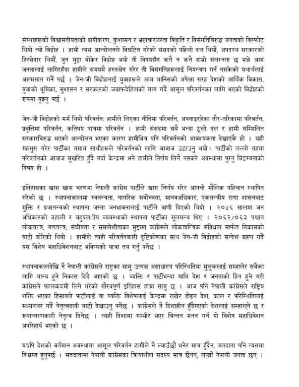 काठमाडौँको भृकुटीमण्डमा सोमबारको बन्दसत्रमा उनले प्रस्तुत गरेको प्रस्तावमा जेनजी प्रदर्शनपछि उत्पन्न परिस्थितिमा विशेष महाधिवेशनको आवश्यकता, विशेष महाधिवेशनको वैधानिक प्रावधान, कांग्रेसको ऐतिहासिक परम्परा, आजको परिदृश्य र विशेष महाधिवेशनको नीतिगत सङ्कल्प, आमनिर्वाचन, उन्नत लोकतन्त्र र बहुलवादी समाजको विकास, निर्वाचन पूर्वगठबन्धन प्रवृत्तिको अन्त्य, सुशासन र भ्रष्टाचार नियन्त्रण, निर्वाचन प्रणालीमा सुधारलगायत विषयहरू समेटिएका छन् ।