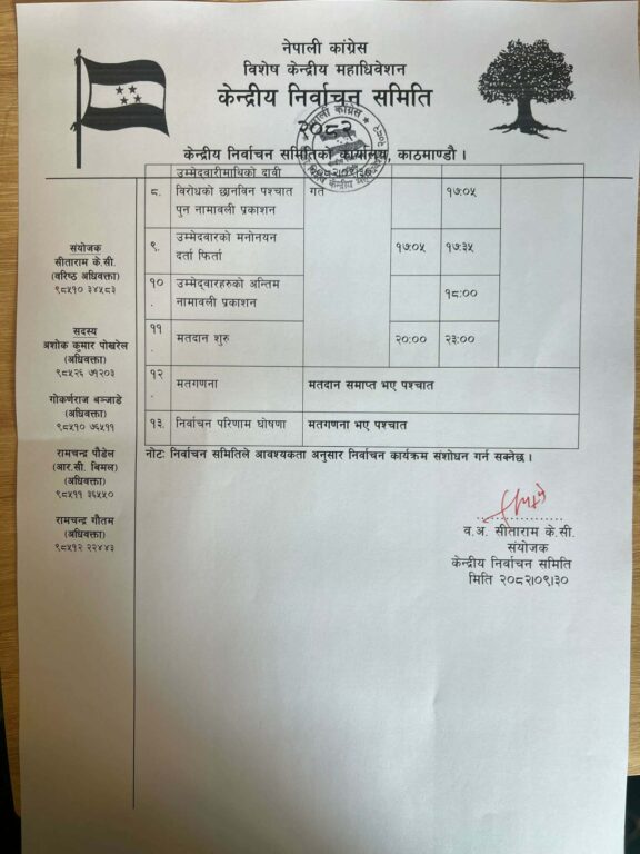 काठमाडौँ । नेपाली कांग्रेसको विशेष महाधिवेशनको निर्वाचन कार्यतालिका संशोधन गरिएको छ । निर्वाचन समितिका अनुसार आज राति ८ बजेदेखि मतदान सुरु हुनेछ । यसअघि आज दिउँसो उम्मेदवारी दर्ताको समय तोकिएको थियो । सभापतिमा गगन थापाको मात्रै उम्मेदवारी परेको छ । त्यस्तै महामन्त्रीमा विश्वप्रकाश शर्मा र प्रदीप पौडेलको उम्मेदवारी परेको छ ।