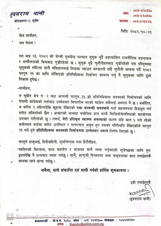 विज्ञप्ति जारी गरी थानीले भनेका छन्, ‘मेरो प्रतिकुल स्वास्थ्य अवस्थाको कारण यहि माघ ६ गते रहेको मनोनयन दर्तामा उपस्थित र तत्पश्चात सकृय हुन नसक्ने परिस्थिति देखिएकोले फागुन २१ गते हुने प्रतिनिधिसभा सदस्यको निर्वाचनमा उम्मेदवार नबन्ने निर्णय लिएको छु।’
