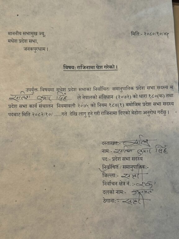 प्रतिनिधिसभाको उम्मेदवार बन्न मधेस प्रदेशका पूर्वमुख्यमन्त्री सिंहद्वारा सांसद पदबाट राजीनामा