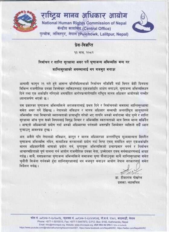 काठमाडौँ । राष्ट्रिय मानव अधिकार आयोगले आगामी फागुन २१ गते हुने प्रतिनिधिसभाको निर्वाचन नजिकिँदै गर्दा राजनीतिक दलका जिम्मेवार नेताहरूबाट भइरहेका अमर्यादित र घृणाजन्य अभिव्यक्तिप्रति ध्यानाकर्षण भएको जनाएको छ ।