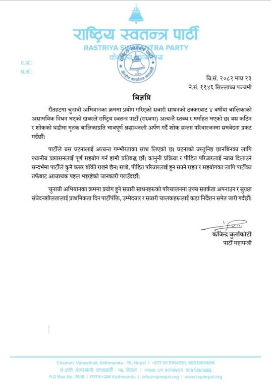 काठमाडौँ । राष्ट्रिय स्वतन्त्र पार्टीले रौतहटमा पार्टीका उम्मेदवारको गाडीको ठक्करबाट बालिकाको मृत्यु भएको घटनालाई गम्भीरताका साथ लिएको जनाएको छ ।