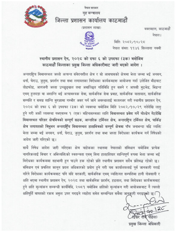 प्रशासनले ‘विमानस्थल प्रवेश गर्ने गोल्डेन गेटदेखि विमानस्थल परिसर क्षेत्रभित्रको सम्पूर्ण सडक, आन्तरिक टर्मिनल क्षेत्र, अन्तराष्ट्रिय टर्मिनल क्षेत्र, पार्किङ क्षेत्रलगायतको विमानस्थल हाताभित्रको सम्पूर्ण क्षेत्रमा पाँच जनाभन्दा बढी व्यक्ति भेला भई अनसन, धर्ना, घेराउ, जुलुस, प्रदर्शन तथा सभा जस्ता विरोधका कार्यक्रम गर्न निषेध गरिएको जनाएको छ ।