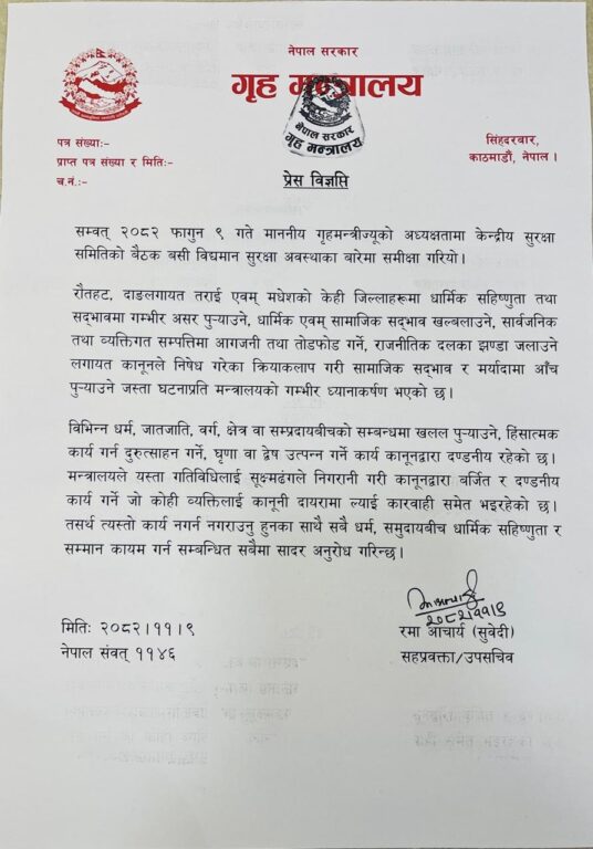काठमाडौं । सरकारले रौतहटको गौरमा भएको घटनामा सबैलाई उच्च संयमता अपनाउन आग्रह गरेको छ ।