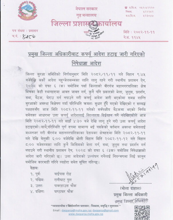 पछिल्लो परिस्थितिलाई मध्यनजर जनाउँदै पर्सा प्रशासनले बिहान ९ः ४५ बजेदेखि अर्को आदेश जारी नहुन्जेलसम्म कर्फ्यू लगाएको थियो । जिल्ला सुरक्षा समितिको बैठकले सुरक्षा अवस्थाको समीक्षा गर्दै परिस्थिति सामान्यतर्फ उन्मुख भएको निष्कर्ष निकालेपछि कफ्र्यू हटाउने निर्णय गरेको हो ।