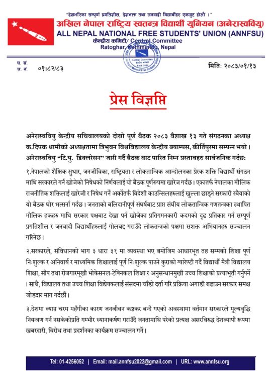 काठमाडौं । नेकपा एमालेनिकटको अनेरास्ववियुले १३ बुँदे ‘टीयू घोषणापत्र’ सार्वजनिक गरेको छ । त्रिवि केन्द्रीय क्याम्पस, कीर्तिपुरमा बसेको बैठकले १३ बुँदे ‘टीयू घोषणापत्र’ जारी गर्दै समसामयिक प्रस्ताव सार्वजनिक गरेको छ ।