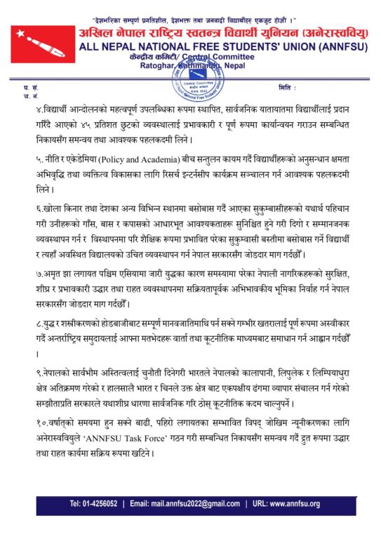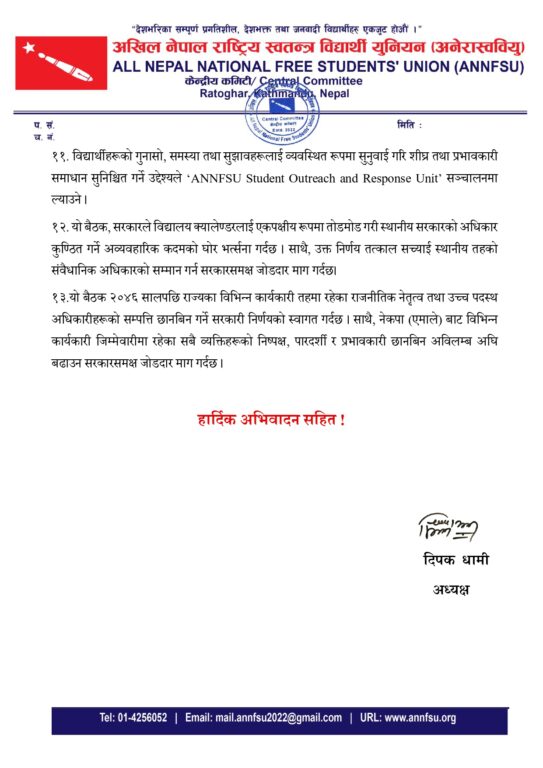 यस्तै, सार्वजनिक यातायातमा विद्यार्थीले पाउँदै आएको ४५ प्रतिशत छुटको व्यवस्था कार्यान्वयन, विद्यार्थीका गुनासो सुन्न ‘ANNFSU Student Outreach and Response Unit’ सञ्चालन गर्ने र विद्यार्थीहरूका लागि रिसर्च इन्टर्नसिपको व्यवस्था गर्न पनि माग गरिएको अध्यक्ष दीपक धामीले जानकारी दिए ।